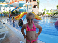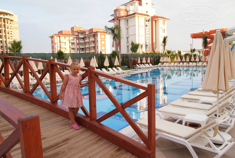 Территория отеля действительно очень не большая, с коляской выходили гулять за пределы отеля, что очень удивило огромное количество отдыхающих с маленькими детьми, буквально каждый второй отдыхающий с детской коляской. Огромный бассейн на территории отеля, но вода в нем была достаточно прохладная , а детский бассейн находился в тени там вода просто ледяная, в первые дни побывали там купаться , но решили не рисковать и купаться в море в теплой воде.