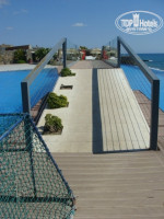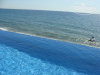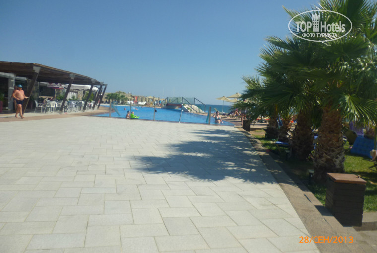 На территории 2 бассейна . Детский с горками и для взрослых - глубокий. Вода в бассейне прохладная. Мы ходили туда после обеда, часов в 15... а утром на море. Вода в море теплая . Во время нашего отдыха где то градуса 24. Погода первые четыре дня нашего отдыха была отличная... солнышко весь день . Температура 28-30. Начиная с 1 октября стали набегать тучки, но все равно было тепло. Пару раз покапал дождик минут на 5. Где то 3-4 октября ветер сменился на северный и купаться стало не комфортно, так как выходя из теплого моря попадаешь сразу в объятия северного ветра , да к тому же волны сильные. Но по видимому самые отважные все равно купались. Причем даже детки . Пятого октября ветер утих, стало снова солнечно, лишь иногда облачка появлялись. Температура правда понизилась до 22-23 градусов, но вполне купально так скажем )))