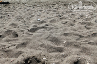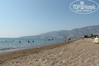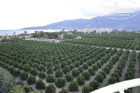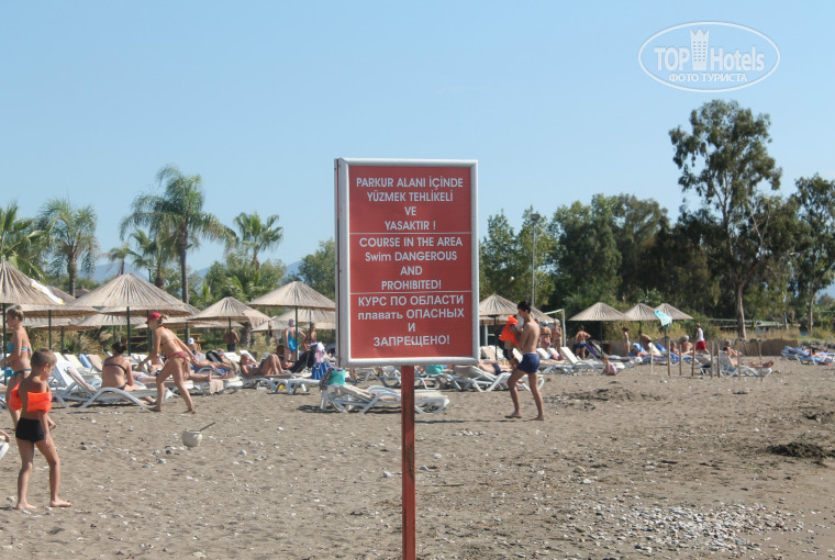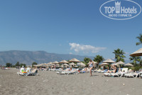 Отель состоит из двух корпусов, главного, где находится основной ресторан, хамам, тренажерный зал, лобби бар, магазинчики; и корпуса, где расположены номера и выдают пляжные полотенца. Отель окружен с двух сторон апельсиновыми плантациями, если подняться на верхний этаж второго корпуса и выйти на лестницу можно сделать очень красивые фотографии с видом на апельсиновые сады, море и горы. Между корпусами есть большой бассейн, но очень холодный. Сам отель и прилегающая территория довольно чистые и ухоженные. К морю необходимо пройти через подземный переход, который проходит под автотрассой. Пляж песчаный, можно лечь как ближе к морю, так и поодаль в зеленой зоне. На пляже постоянно не хватало лежаков, т.к. многие из них были заняты загорающими полотенцами наших соотечественников. Там видимо такая традиция, занять лежак с утра и прийти только вечером для того что бы забрать полотенца. С двух сторон вокруг пляжа в море стекают реки, но не думаю что это чистые горные речушки, скорее отходы жизнедеятельности людей, что не очень то приятно. На самом пляже постоянно отдыхают три дружелюбные собаки, которые периодически лежат на освободившихся лежаках. Также там есть бар, где разливают напитки (о них напишу ниже) и пекут турецкие лепешки, которые, к сожалению ни разу не удалось попробовать, т.к. один человек подсовывал пекущим женщинам по четыре-шесть тарелок и где то на 15 человеке женщины расходовали все тесто и убегали. Также около моря есть небольшой детский бассейн и площадки для мини гольфа, а так же можно поиграть в пляжный волейбол и покататься на банане (15$) и скутере (45$).