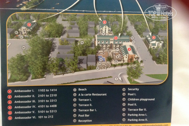 N 3 находится через пешеходную дорожку от главного это Ambassador Anex 3*. там есть детская площадка-всё остальное в главном корпусе.