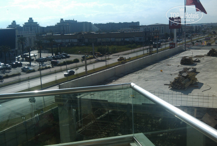 3) В отеле в принципе нет ни одного номера с удачным видом из окна. Восточные окна выходят в окна стоящего напротив отеля Рамада, южные - на довольно оживленную дорогу, западные - на стройку и дорогу, северные - на пустырь с рекой и комарами. На мой взгляд лучшее из зол это южные и западные окна 5 корпуса. По крайней мере ночью дорога и стоящие на первой линии отели красиво светятся огоньками, и можно наблюдать фейерверки, которые примерно раз в 2-3 дня проводятся в отелях Риксос, Кервансарай и Титаник. Жить ниже 4 этажа тоже не рекомендую (по нашему это пятый этаж, потому что первый этаж у турков считается нулевым), ибо там вообще ничего не видать. Номера пятого корпуса, заканчивающиеся на 06 и 07 выходят на юг, 08,09,10,11,12 - выходят на запад. Вид из наших окон на дорогу и на стройку можно посмотреть в прикрепленных фотографиях.