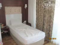 В 11 часов мне предложили номер под крышей, как мне кажется, семейный эконом класс, с большой 2-х спальной кроватью, кучей полотенец в душе, но без балкона. Мне это не понравилось, так как я заплатила, 45 тыс.руб за 10 дней совсем не за эконом класс. На ресепшене практически сразу, наверно, учитывая мою очень корректную просьбу, поменяли номер на одноместный с балконом на 5 этаже с видом на дорогу на пляж (но решал, как я поняла, Али, девушки не очень хотели идти на встречу). Номер небольшой, но уютный. Убирали, меняли полотенца каждый день. Воду не поставили в холодильник один раз, но в отеле и на пляже есть кулеры, проблем с водой нет вообще. Один минус: в номере не подключен телефон(( Персонал очень вежливый, доброжелательный. Каждый день на ресепшене спрашивали, как у меня дела, что приятно.