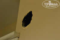 ШОК, выпив пол банки корвалола, выкурив две пачки сигарет на психе - (см фотки номера к отзыву), пошли на ресепшен, с просьбой поменять это безобразие на что то другое, плюс выдать нам сейф... т.к. было уже поздно решили отложить на завтра. Т.к. поездка до отеля около 2-х часов, уставший рухнул спать. Подробнее про номер, комментарии к фото... Комнатка очень мега маленькая, дверь - полметра - сразу кровать, через полметра телик 80-х, как показывает - см на фото. На стенах пятна, закрашенные другой краской, не как основная стена. Двери закрываются с пинка, иначе никак. Разбухли или не знаю что там сними. Технологическое отверстие в стене, с выпавшей крышкой на полу. Кровать норм для тройки, балкон не закрывается на ключ. Очень очень очень древняя мебель. Кондиционер оч. старый, с отломанным "крылом", пришлось чинить его своими силами, подкладыванием бумажек, иначе вибрация была такая от него что спать невозможно. Но при этом - холодит и греет. На балконе отвалившаяся штукатурка, зато вид на море. Балкон большой, размером с комнату примерно. Кругом растительность, балкон норм, если бы еще отделку нормальную сделали. Сан узел- огромный, размером как балкон и как комната. Первое что бросилось в глаза и нос, когда вошли в номер - дичайшая влажность, затхлый запах "древности", сантехника до невозможности ржавая, с трубы на унитаз постоянно капала вода, подтекало соединение. Поэтому вечно дикая влажность, лужа на полу и туча комаров. Плитка в плесени, горячую воду приходилось "ловить". Извести на душе килограмм. Видно что давноо ничего не менялось. Дверка в душевую кабину отвалилась после первого открытия, потом повесил своими силами обратно. Но самое главное - провалившийся потолок (см. фото). Он провисает в центе сантиметров на 30-40!!!