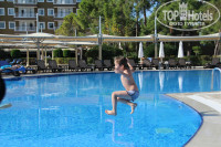 Территория около бассейна чистая, но вода сильно хлорированная. Горки работают в непонятном режиме. Дело в том, что сейчас в Сиде уже после 3х часов не покупаешься, солнце садиться. А горки работают в летнем режиме. Я бы на осенние каникулы сделала работу горок с 10:00-15:00 (максимум), и все. А то получается, в 12:00 они их отключают, в тот момент когда светит яркое солнце.