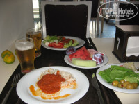 Питание однообразное, без изысков, но все приготовлено довольно вкусно. Очень вкусные оливки, брынза, овощные салаты, зелень. Мяса практически нет, в основном, соевые сосиски, тефтели. Иногда дают курицу, один раз в неделю очень вкусную рыбу. На гарнир вкусно приготовленный рис, овощные рагу, картофель фри, макароны. Суп готовят на ужин (обычный суп-пюре, но всегда разный). Довольно много фруктов: яблоки, мандарины, сливы, арбузы, дыни. Недостатком для меня было отсутствие выпечки (из выпечки были только хрустящие слоеные палочки с сыром на завтрак, очень вкусные, но это всё). В целом, нас еда вполне устраивала, каждый выделил для себя что-то вкусненькое. Из напитков: чай, кофе из кофе-машины, кола, алкоголь: неплохое пиво, вино - средненькое, простейшие алкогольные коктейли, местная водка - раки (не пробовала).