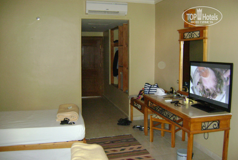 В отель прибыли около 16 часов,завезли нас первыми из-за особенностей Египетских дорожных развязок.Нас была большая группа.На Рецепшене все говорят по русски,и вообще,создалось впечатление,что в отеле отдыхают только русские клиенты Пегаса.Очень редко мелькали немцы-кайтеры (вид водного спорта-доска под парашютом) и немного украинцев.В паспорт положили 20 баксов,по прежнему отдыху знаем,что будет нелишним.И правда,всех экономных расселили мгновенно с видом на пустыню и ветряки,а нам дали отличный номер на третьем этаже в конце крыльев основного здания с боковым видом на море!Номер очень хороший,всё работало,кондиционер с пультом,ЖК панель огромного размера,сейф,мини холодильник.При желании на ресепшене можно взять чайник и набор чай-кофе,но нам не нужно было.При заселении дают на номер !,5л. бутылку воды,потом в неё нужно наливать воду из кулеров в коридоре.Очень удобно-вода всегда холодная..Большой балкон,на нём стол и кресла,двери на балкон зеркальные затемнённые,очень удобно,солнце не мешает отдыхать после обеда.Кстати,насчёт номеров-не берите номера с прямым видом на море,они дорогие,но это ужас-ужас!!!С начала этого лета отель работает по системе 24 часа!Под окнами этих дорогих номеров-люкс находится бар,который работает круглосуточно с подачей алкоголя,биллиардом и всеми делами!!!В нашу бытность там на террасе этого бара собиралась огромная группа молодёжи,которые орали и ржали до 5 утра!!!Наш номер расположен далеко и то без закрытого балкона не уснёшь,а что слышали бедные обитатели люксов!!На территории отеля идёт ремонт,делают детские бассейны и мини-аквапарк,эти работы ведутся с 8 до 17 под окнами отдельно стоящих 4х и 3х этажных корпусов и бунгало!Так что днём не поспите и деток не уложите.Зато после ремонта будет красота с зАмком и всякими горками и зверюшками.