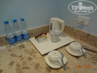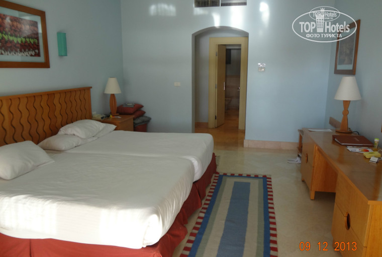Большой, заявленные 54 метра ощущались), стояли две двуспальные кровати, которые мы сдвинули. При заселении нам презентовали тарелку с фруктами. Предлагали принести кроватку для сына, но мы отказались. В номере есть тапки, халаты, из мелочей в ванной - мыло, шампунь, гель для душа, лосьон для тела, пилка для ногтей, нитки с иголкой, губка для обуви, ватные палочки и диски... (может кому интересно) Все исправное, горячая вода без перебоев, есть столик для чая (см фото) чайник, чай, кофе, сахар, сливки. Все ежедневно обновлялось. Ванна, душ, биде. По телевизору из наших только Первый канал. Минус номера (хотя номер то тут и не при чем) - комары! Ребенка покусали на вторую ночь - страшно смотреть. Позвонила на ресепшн (знание языка!)) через 5 минут принесли фумигатор и таблетки. На наши таблетки Раптор египетские комары не реагировали. На запах подгнивающего банана который сиротливо лежал на тарелочке дня три-четыре пришли муравьишки. Маленькие, домашние. Позвонила на ресепшн (Язык-язык), через 3 минуты прилетел уборщик со спреем, обработал все, больше муравьев не было. Не тащите еду в номер и гостей нежданных не будет. Воду приносили регулярно, сначала по 2 бутылки по 0,5, по нашей просьбе стали носить 4, т.к ребенок... ну по номеру вроде все...