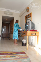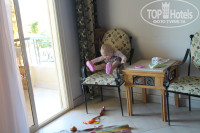 В номере был обычный старенький телевизор, большой стол, 2 кованых стула, большая скамья с мраморной столешницей, сейф, мини-холодильник, кондиционер в каждой комнате. В прихожей бы небольшой шкаф и открытые полки из старого страшного дерева.