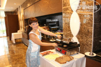А вот в Майе (Ворлд Хотел) мы видели как на глазах рождался отель! При нас клеили обои (не везде, конечно, а у лифта), крепили перила, запускали амфитеатр и а-ля-карт ресторан. Каждый день какой-то приятный сюрприз! О! Дорогу за день выложили плиткой, метров 200! Утром, числа 15-го с сыном мы заглянули на дискотеку, а там оборудование в чехлах и на них слой пыли. Но вечером аниматоры всех пригласили на диско и все работало! Звук и свет. Брат мужа как-то спрашивает у него в хамаме: «Это меня так штормит, или потолок изменился?» Оказалось, что потолок, что несколько дней сиял над нами белой оштукатуренной поверхностью, уже радует плиточкой. Я спрашивала себя: «Хотелось бы мне снова поехать в построенный к сезону отель?» В первые дня 4,я думала: «Категорически нет!» Через неделю: «Ну, можно, но не раньше, чем через 7-10 дней после первого заезда, чтоб все уже работало» . А вот через 12 дней, увидев очереди на ресепшен (это нас селили в пустой отель, а они уже ждут номера до 14-00) и в ресторане, я подумала: «Можно попробовать, но если отель будет строить Али. Ему я уже доверяю». Честно, так и подумала))))