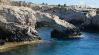 До пляжа идти 5 минут. Пляж хороший, чистый, песочек клевый. Лежаков много, но мы их не брали никогда. И когда на пляж приходите, идите чуть левее и дальше, там заход в море лучше и лежаков меньше. Потому что там, куда вы приходите изначально камней в море замело и заходить по мешкам в песком как-то не очень. А море конечно великолепное. Чистое, красивое. Под водой правда смотреть особо не на что, но я и не любитель этого. И кстати, если дойти до конца пляжа (не в сторону пирса, а в другую), там начинаются скалы, с которых можно понырять. Чуть дальше пройдите и найдете скалу, которая часто фигурирует на картинках про Кипр (типа мост желаний он как-то называется).