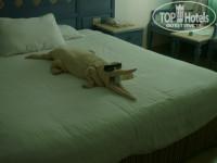 НОМЕР: И ура мы номере, в прихожей шкаф на 3 отделения, есть вешалки, в нем же бесплатный сейф (инструкция на дверце шкафа). В ванной есть все необходимое: полотенца по большому и маленькому на каждого человека, шампуни, мыло, гель для душа, фен. Сама комната с большой двухспальной кроватью и одной дополнительной. Никому ничего не говоря, после обеда наш уборщик нам привез еще одну кровать и поставил её между уже стоящими. Еще в комнате были 2 прикроватные тумбы, комод с зеркалом и пуфом, на другой стене зеркало, чтобы смотреться в полный рост, в углу столик, на стене плоский телевизор. Есть балкончик с двумя стульями и маленьким столиком, вид был на семейный бассейн с горками, очень тихий т.к. неподогреваемый и купаться там было довольно таки прохладно. Номер чистый, убирались хорошо, постоянно менялись полотенца и постельное белье, оставляли чаевые, крутил нам разные фигурки, в минибаре стоят бутылочки с колой, мириндой, спрайтом, кажется их было 6 или 8 штук (бесплатно на неделю пребывания, если надо больше, то за дополнительную плату), простую воду уборщик приносил ежедневно по 3 бутылки (0,5л), нам хватало, до кулеров не бегали.