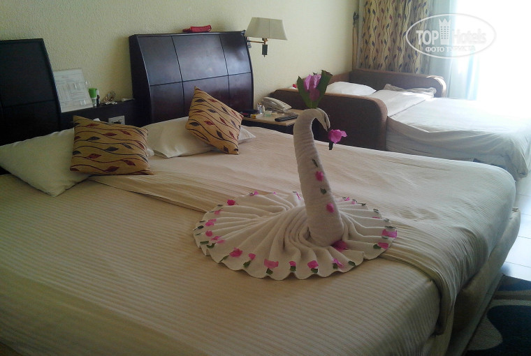 - Прилетели в три часа дня, нас сразу заселили в 4 корпус и одели золотые браслеты. Номер хороший, уютненький, с видом на бассейн и море. Принесли приветственную корзину фруктов и комплимент от отеля в виде тортика (у дочки, в день прилета ,был День рождения) - мелочь, а приятно !