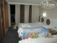 Начнем по порядку. Размещение, приехали мы в районе 11-30 утра в отель, на размещение не надеялись, были готовы ждать, нам одели браслеты и мы пошли к бассейну, ждать заселения, успели только перекусить вкусными лепешками, как нас позвали в номер, то есть заселили где-то после 12-00. На ресепшене девушка хорошая, обслуживание нам везде понравилось, ни хамства, ни грубости мы не встретили. Номер хороший, на троих + мы попросили детскую кроватку принести, не могу сказать, что большой, но нам было достаточно, сантехника работала, кондиционер тоже, в номере есть холодильник, но так как стоит в ящике, то холодильные свойства его значительно снижены. В следующий раз рассчитывать на холодильник не буду.