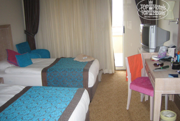 Отличный отель, новый. Номера чистенькие свежие, 70% номеров выходят на море, в минибаре 5 напитков безалк., кондей центральный, поставлен на 26, но этого за глаза хватает (отключается при открытии двери или балкона). Действительно территория не большая,но есть центр города в 10 минутах хотьбы. Хотя и в отеле есть чем заняться: собственные водные горки, боулинг, бильярд, дискотека, кальянное помещение. Пляж через дорогу, но она маленькая и со светофором с кнопкой, не знаю уж почему кому то из ниже писавших отзывы машины не уступали дорогу и не останавливались на красный свет, с этим все впорядке, безопасно. На пляже у моря бар с безалкогольными напитками и пивом, постоянно дают арбузы и дыни, с 12 всякие тосты и и прочие хлебо-колбасные изделия, в 4 часа дают кукурузу. шизлонгов всегда хватает, даже если в 12 часов придете, что нельзя сказать о пляже у бассейна, они занимаются с 7 утра. С питанием тоже проблем нет, хотя я когда приехала первые 2 дня жила почти без мяса, не заметила в основном ресторане гриль-бар (на терассе за углом) там готовят курицу, индейку, рыбу, баранину, овощи, картошку - гриль. Много фруктов арбузы, дыни, виноград б. и к., персики, никторин, абрикосы, черешня - все сладкое (кроме дыни, она во всем кемере не очень). 3 ресторана Аля-кард, в который можно бесплатно сходить в каждый по разу. тель работает по системе ультра все включено, т.е. напитки импортного производства бесплатно, но их надо выбивать есть коньяк, виски и шампанское в лобби-баре, там готовят и хорошие коктейли в шейкере. В баре у бассейна все попроще, особенно вечером когда большое количество народа, кстати он работает круглосуточно бесплатно, ночью есть еда, точнее перекусон (макароны, сыр, овощи). Хорошая вечерняя анимация, особенно для детей. Ночная жизнь кипит около отеля, ниже уже говорили про 2 дискотеки (при закрытом балконе спать не мешают), одни из самых больших и лучших в кемере через дорогу, в 5 минутах ходьбы (если кого интересует - вход 10$, пиво - 10$, спрайт, кола - 8$, джин, виски (местное) - 15$) Аниматоры иногда организовывают общие походы на дискотеку- собирают всех желающих потусоваться в холле в 12, и все организованной колонной идут или едут на диско.