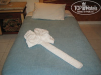 Поселили нас в номер 639 - ближайший к клубу «Паша», так что с 22:30 и до 04:00 в номере невозможно было находиться, аж кровати вибрировали и флаконы на столике подпрыгивали))) Номер на удивление чистый, за это большое спасибо уборщику, который каждый день намывал полы и зеркала, менял полотенца и крутил всяческих лебедей. Про душевую кабину здесь писали не раз, так вот, она реально маленькая, я со своим 42-м размером постоянно билась то о кран, то о полку. Хорошо хоть шторка была длинной и мы не устраивали потоп. А так в номере всё работало, перебоев с водой не было (единственное, напор был немного меньше, когда все приходили с пляжа).