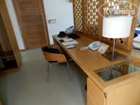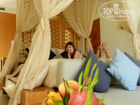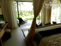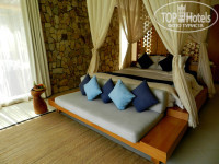 В комнате красивейшая кровать с балдахином и пристроенным диванчиком. За кроватью есть рабочая зона с письменным столом, под ним минибар и холодильник. Есть 2 больших шкафа-гардероба. В ванную комнату вход с 2 сторон, т.е. по вилле можно ходить кругами)