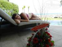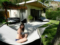 Выходим через стеклянные двери-окна лицевой стороны виллы и попадаем на свою площадку отдыха, есть шезлонги чтобы позагарать, есть чудесный гамак, а также есть зона с диванчиками и столом, чтобы попить вина или чая на закате дня)
