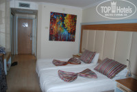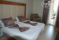 НОМЕР. Номера наши выходили на дорогу и горы и небольшой рыночек. Минус этих номеров, что редко бывает солнце и учитывая большую влажность в Турции наши купальники с вечера до утра не успевали высохнуть. Поэтому рекомендую взять 2-3 сменных купальника, чтоб утром не одевать влажный купальник. Если бы мы ехали минимум на 10 дней, то поменять номер за отдельную денежку и при наличии номеров, выходящих на территорию отеля и море не составило бы труда. Сами номера очень хорошие, новые. В комнате на полу ламинат, а не плитка. Вместительный шкаф для одежды и много плечиков. Сейф в отеле платный 1,5 евро сутки. Мини бар отсутствует. Убирали номера каждый день и довольно неплохо. Полотенца меняют если их бросить на пол, если оставить на крючках двери, то не поменяют. Мы очень любим прохладу, но кондиционер там цетрализованный и самим температуру не выставить. Работает, если закрыты двери балкона. Но особой прохлады он никакой не дает, а ночью вообще нам показалось дует горячим воздухом. Мы решили, что такую температуру они включают из-за большого количества детей в отеле. Мы не включали кондиционер, а просто открывали на ночь балкон. Ночью довольно прохладно и эта прохлада проникает хорошо в номер. В первую ночь нам мешали спать машины и пение мулы, но в в остальные мы засыпали как убитые, только дойдя до подушки и нам уже ничего не мешало. Обычно мы берем по приезду утюг и гладильную доску. Здесь этого даже не понадобилось, т.к из-за влажности даже в шкафу наши вещи выпрямились за сутки и так. Аренда утюга и доски стоит 2ч - 5 евро. Расчетный час в отеле как и везде 12-00. Но при желании можно продлить: до 15-00 - 20 евро, до 17-00 - 40 евро. Наш самолет был в 21-30 и забирали нас из отеля толь в 17-30, мы продлять номера не стали. Сдали вещи в багажную комнату (бесплатно), весь день были на пляже, обедали в ресторане, перекусывали в барах, ополоснулись в душе на пляже, переоделись в туалете. При этом пляжные полотенца (их выдают по карточкам бесплатно) нам разрешили взять на пляж и не сдавать при выселении из номера. Перед выездом мы их сдали в спа-салоне и карточки вернули на ресепшене. Браслеты с нас не срезали.
