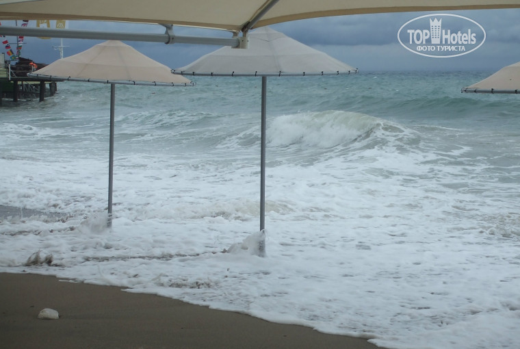 Море в первые два дня нашего приезда бушевало, были огромные волны, шёл дождь. После, когда погода устаканилась, то купались каждый день, вода прогревалась с каждым днём всё быстрее. Пляж не большой, для не сезона лежаков хватает всем, даже если мы и приходили в 10 часов утра. Как в сезон не знаю, но принципе есть два пирса, на них много лежаков, также подушки, на которых тоже можно разместиться. На пирсах удобные лесенки для спуска в воду.