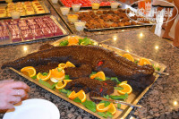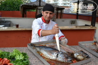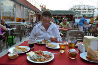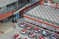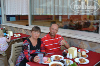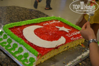 Питание было достаточно разнообразным и обильным, нам понравилось, единственно, что из фруктов давали только апельсины и арбузы, но два раза в неделю приезжает рынок и мы там покупали фрукты за 1-3 доллара. Хотя, честно, есть не очень хотелось, но на пляж с собой брали полакомиться. Хотя мне говорили, что в Турции много сладостей не дают, но на обед и ужин было очень много пирожного, торты, муссы, и другие десерты. На завтрак было вседа 4 сорта варенья, в том числе из лепестков розы, а еще давали какое-то ореховое масло, не знаю, как называется, не могла поэтому найти в магазине. Утром всегда было 5-6 сортов сыра, много зелени. В обед и ужин вкусные супы, много салатов и овощной нарезки, можно заправить на свой вкус маслом или другим соусом, которые стоят тут же в емкостях. Я пробовала все напитки алкогольные, кроме анисовой водки. Пиво вкусное, вино полусладкое, судя, по отзывам, его никто не пьет, а судя по ресторану: его пьют все, вот такой курьез))) Колбаска действительно соевая, но это не потому, что туристов так кормят, а потому, что в Турции все ее едят. На завтраке дают булочки из бездрожжевого теста: вкуснота. В отзывах иногда пишут, что мясного дают мало, но считаю, что это не совсем правда, как минимум два сорта мяса, и в салатах мясо (кура) на обед и ужин всегда есть, но если тебе не хатило отбивного мяса, или на гриле приготовленного, подойди и тебе дадут еще.