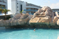 Приехали в 15:30, и нас сразу стали заселять,одели браслеты. Нам с мужем дали номер в одном корпусе, а друга расселили с подселение на один день в другом корпусе, так как вроде не было номером, с обещанием переселить на следующий день(на следующий день переселили с нами по соседству). Номера хорошие, чистые, убирали каждый день, полотенца чистые каждый день. Советую брать номера во втором корпусе там все номера с видом на море. К персоналу никаких претензий,да, некоторые очень плохо понимают по русски, но объяснить нормально можно и все они понимают. На счет еды голодными точно не будете, разнообразие очень большое: овощи жареные. пареные, говядина,индейка,курица,телятина, рыба жареная,пареная, даже форель была,салаты,овощи, на завтрак куча всего,фрукты яблоки,грейпфруты, апельсины,персики давали, арбуз был каждый день,местные фрукты.Был бар у пляжа с 10 до 18 бутеры, карточка фри, овощи, фрукты, в 17 в бассейнов давали сладости, в 23:30 возле бассейна ночной суп и овощи. (Голодными не были) Территория большая, красивые деревья, цветы, кусты, очень здорово вечером выйти прогуляться. О пляже не знаю почему так люди пишут, ведь в описании отеля ясно сказано пляжа нет, двухуровневая платформа на одной песочек, на второй уже все лежат и загорают, прыгают,и лестница там нормальная, очень много купаются с детьми(на кругах или матрацах). Аниматоры молодцы очень стараются как вечером так и днем ходят всех зазывают на разные игры, устраивают соревнования. И ночью для молодежи дискотека в аквапарке и вывозят в клуб в сторону Алании. Веселые аниматоры Али и Самет)) Рекомендую поехать)) кого что интересует спрашивайте)))