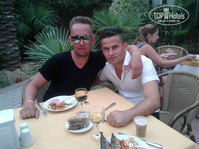 СЕРВИС. Здесь я ставлю 5 баллов, были конечно недочеты, но отношение людей к нам, было просто очень вежливым, не у всех конечно, но некоторые личности заслуживают особого внимания. Ахмед, с ним я познакомился за барной стойкой, он работает и в баре и в ресторане, советую вам с ним подружиться, он очень дружелюбен и всегда поможет вам. Для тех кто поедет туда я выложу фотку ниже с ним (мы будем вдвоем сидеть за столом в ресторане на улице). Рокки - аниматор, с ним советую тоже чаще общаться, он всегда поможет и подскажет когда ближайшее мероприятие, фотка с ним тоже будет на ресепшене. Бармены достаточно вежливы, не жалеют напитков и достаточно быстро все делают, официанты всегда спрашивают можно ли убрать со стола, стараются делать все во время. В общем я остался доволен сервисом.