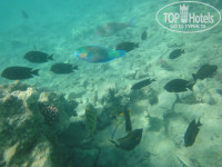 С пирса видно рыбок. Когда начинают бросать в воду булочку, чего делать нельзя, но всем почему-то пофиг, слетается стайка рыб, разных, цветных и очень красивых. Риф начинается практически от пирса, сначала бесцветные мертвые кораллы, но чем дальше, тем красивее, тем больше живности. Отлив тут практически не заметен (в отличии от Санрайз гарден бич, где море уходит метров на 400 и люди бредут по мелководью)