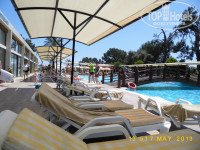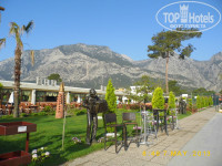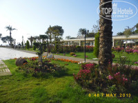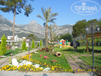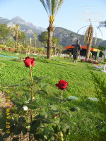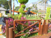 4. Территория и природа. С одной стороны отель окружен горами, а с другой стороны морем, очень красиво!) Территория ухоженная, много цветов, пальм и разных статуй) Для детей большая игровая площадка с батутом, также есть карусели, жетончик стоит 2$. Есть турецкая баня, в которой хозяйничает позитивный Нурик) На территории 2 бассейна, первый тихий, у жилых корпусов, второй шумный и веселый, ближе к морю. Также есть лягушатник и бассейн с 3 горками. Отмечу, что бассейны всегда чистые, но и хлоркой не воняют!