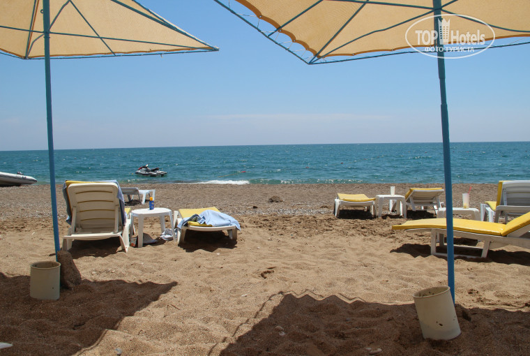 Пляж очень хороший, чистый, песок и мелкая галька. ПЛИТ НЕТ. На пляже есть бар с безалкогольными и алкогольными напитками, чаем и кофе. Также в определенные часы прямо на пляже можно перекусить. До пляжа раз в час трансфер, пользовались пару раз, потом сами ходить стали, прогулка по времени 5-7 минут.