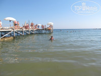 Море совсем рядом , но ... не фонтан . Плохой вход в воду глина , камни , песок . Вода часто грязная . Лучше заходить с пирса или нырять , но осторожно - глубина 2, 5 метра . Хороший пляж справа (если стоять лицом к морю) от отеля , можно пройти по пляжу , затем через сосновый лес , около 200 метров . Там вода гораздо чище и лучше вход в море .