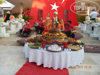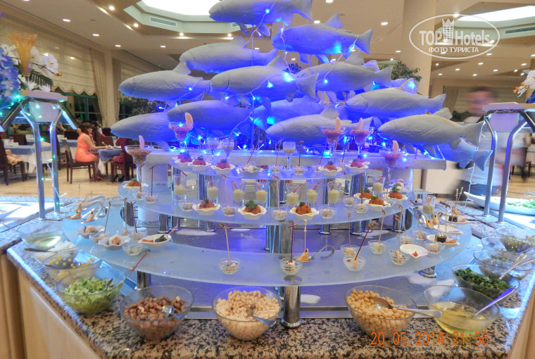 Отель отличный, питание хорошее: много разных мясных, рыбных, овощных блюд, блюда из морепродуктов, зелень, блинчики, каши, фрукты (черешня, клубника, арбуз, дыня, персики, абрикосы, нектарины, яблоки, апельсины, бананы), соки, газировки, мороженое, чай, кофе, пицца, лепешки, колбаски, сосиски... Дыни, правда, не сладкие, но это, видимо, ещё не сезон. И супы были не только пюре, но и с прозрачным бульоном. Спиртные напитки разнообразные. Есть возможность заказать множество различных коктейлей. Бармены делают всё с душой. Вечером желающие могли приобрести импортный алкоголь прямо в отеле почти по ценам Duty free. Жили в основном корпусе. Проживание спокойное, комфортное. Правда, в номер мы приходили в основном только ночью. Всё работало исправно. Чисто и уютно.