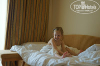 Номер мы брали самый дешевый, с видом на бассейн(на 2-ом этаже). Номер старый, судя по мебели и шторам. Также не понравилось, что полотенца все застиранные, уже серые, халаты в пятнах...Пол-кафель, очень холодный. Стелили покрывала на пол... Наборов чай/кофе не оказалось, воду на каждый день не дают. Но это единственные неприятные мелочи. Стояла бутылка вина красного по прибытию, в подарок :)