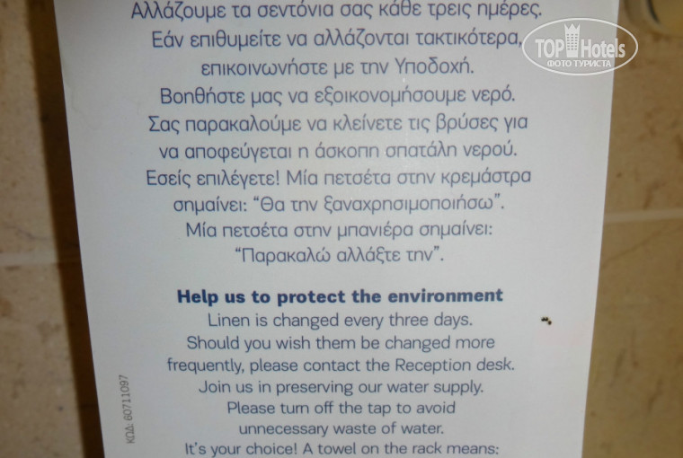Номер 410 на 4 этаже главного корпуса: вид на гору, на дорогу (на Линдос), справа видно крышу рецепшн, магазинчик и место отправления паровозика; сразу внизу - пальмочки и мини гольф. Довольно большой балкончик – там замечательный воздух, хоть и по дороге постоянно гоняют мотоциклы и гулит горлица, чирикают воробышки. Мы взяли верёвку и прищепки и так сушили вещи на балконе (а вообще бельевая веревка в ванной).
