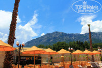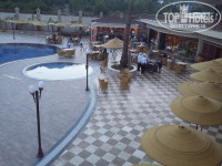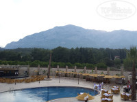Территории больше чем достаточно,2 бассейна взрослый и для малышей,лежаки всегда есть свободные ,амфитеатр на сцене которого играет спокойная расслабляющая музыка(спасибо кстати за подборку треков нашему любимому Dj))),во время который вы купаетесь в басейне или кушаете на террасе.При этом вид абалденный на горы,это надо увидеть самому!