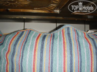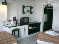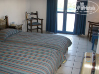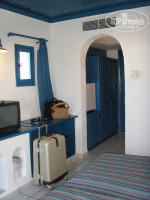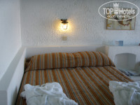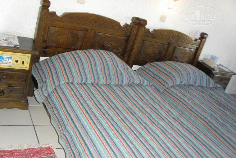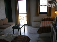 В номерах то же убожество, что и снаружи. В номерах категории "стандарт" жить вообще невозможно - две убогие, узкие, сосновые кровати, между матрасом и спинкой кровати огромная щель (позиционируется отель как 4 звезды, на минуточку). Покрывала - тряпки полосатые, самые дешевые тряпичные коврики. Все изрядно поюзанное. Отделка стен - побелка, освещение - бра, типа станционных фонарей. Короче говоря - так называемый "Критский" стиль, который используется, когда хотят очень сильно сэкономить на отделке и на мебели. Поменяла за доплату номер на "улучшенный". Бонусы номера - двухспальное "ложе" (матрас, который покоится на бетонной раме), такой же, только односпальный дополнительный топчан, чайник с чашками и банный халат, вид на море. Стены и станционные фонари те же самые. Вид на море, конечно, сильно скрасил существование.