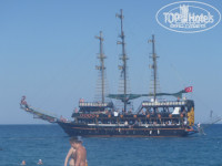 Дорога на пляж - отдельная история - проходит она по торговым рядам, продавцы в которых, соглашусь, весьма навязчивые. Сначала нас это раздражало, но потом даже было весело. Турки народ очень очень общительный и веселый, ну скучно им целый день просто так работать. Вот и пристают постоянно к русским туристам. А сколько русских слов интересных выучили! Гордятся этим и постоянно их вслед нам выкрикивают - в общем было весело. На пляже всем заведует смотритель по имени ВЕЛЛИ - веселый, добродушный и очень ответственный дядечка. Советую с ним подружиться, тогда с лежаками у вас проблем не будет.