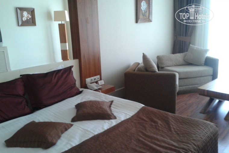 Номер очень просторный. Большая двуспальная кровать, над кроватью зеркало. Два кресла и столик, письменный стол, телевизор, холодильник. В холодильнике напитки бесплатно. У меня были бутылочки пепси и фанты, у кого-то еще и пиво. Мини бар пополняется раз в неделю. Питьевую воду в бутылках всегда можно взять в баре или в ресторане. Так же есть шкаф для одежды, в котором находится сейф. Ключ от сейфа можно взять на рецепшен, залог 10 долларов. Так же под залог карточка на пляжное полотенце, тоже 10 долларов. Полотенца выдают в спа-салоне. В ванной шампунь, гель для душа и мыло. Пополняется регулярно. Даже если вы использовали половину флакончика – вам его поменяют на новый. Убирали в номере хорошо. Только иногда уборка была после обеда, когда хочется немного отдохнуть. А вместо этого приходилось сидеть в холле.