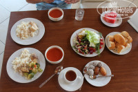 Что касается питания: мясо и колбаса - все соевое; овощи и фрукты постоянно, также брынза разных сортов. В принципе, если Вы не привереда, то стол на 3-4.