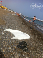 На пляже галька с крупным песком, сам пляж грязный. Вход неудобный. Сразу начинается глубина и всё время после обеда были волны.