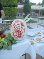 Еда разнообразная, но в обед и на ужин. На завтрак можно бы было делать тосты, омлеты, блинчики ежедневно, а не время от времени. В один из дней молоко было кислым, но его тут же заменили. Очень понравились десерты – до этого и не представляла, сколько всего можно приготовить из манки. Официанты в основном работали оперативно. Но что поразило – обилие мух в столовой и то, что скатерть со стола не меняли, а просто стряхивали с нее крошки. И самый главный минус – если в обед или на ужин прийти на 5 минут позже, то сесть уже негде. А так как люди едят не за 15-20 минут, а трапезничают обстоятельно, то ждать приходилось долго. Недостающие приборы люди просто брали с других столиков. И создалось ощущение, что столики на улице люди занимали уже после завтрака. И никогда раньше не видела, что можно было выносить такое количество еды – с едой люди были повсюду, особенно на пляже – тарелки, мусор, естественно, мало кто за собой убирал. Вода есть в холодильнике у бара, но она почти всегда теплая. Пекли лепешки, за ними всегда была очередь – но очень вкусные)) Фруктов было не много – сливы, дыни, арбузы - не сладкие. Была и черешня. Самыми вкусными оказались красные яблоки! Было мороженое – но лучше бы его сделать порционным, в маленьких стаканчиках. Или дать возможность положить мороженое в мисочку. Не всем по вкусу вафли. И если отель - все включено – то на протяжении дня в такую жару лучше предлагать мороженое и фрукты. Отдельный плюс - чай. Он не из пакетиков, а заварен в маленьких чайниках. На ужин на столах всегда стоит вино, удобно, что не нужно стоять в баре в очереди.
