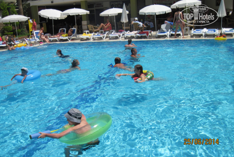 Здравствуйте. Отдыхали в отеле с 19.06.2014 по 28.06.2014. Добирались с аэропорта около 3-х часов. С 8.00 ждали заселения до 13.30. Заселили в корпус С на последний 8 этаж, хотя просили корпус А, но не пожалели, там более спокойно, да и в бассейне народу меньше. Бассейн небольшой, но лежаки всегда были, в корпусе А бассейн немного больше+горка, но лежаки всегда заняты. Здесь проводят анимацию, танец перед обедом с прыжком в воду. До моря 5 мин., лежаки на пляже бесплатно, пляж - мелкий ракушечник, вход в море не очень удобный - плиты покрылись водорослями и сместились, при волнах очень трудно устоять. моя дочь пыталась сразу плыть, чтобы по дну не ходить. Анимация вечером на пляже, сначала детская, потом для взрослых, потом предлагают ехать на дискотеку в Аланью. На анимации были 3 раза, из них 1раз было более или менее интересно , дочке (10лет) было скучно. На пляже бесплатно наливают колу, воду. Спиртн. напитки за 4$.
