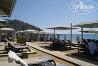 Пляж большой и достаточно широкий. Часть шезлонгов стоят на помостах, часть просто на песке. Хорошие большие тенты над ними. Сам пляж песчаный, при входе небольшая полоса гальки (метра 2 шириной). Можно заходить и босиком, но мы купили резиновые тапочки и не мучились не грамма при заходе в воду. За счет того, что при входе галька вода просто сказочная, - чистейшая. На пляже через каждые 100-150м. стоят палаточки, где можно взять пляжные полотенца, и прохладительные напитки, мороженое, нарды, а также ведерки с лопатками для детей и даже (где-то посередине пляжа) можно взять книжку почитать. Периодически ходят работники пляжа и предлагают отдыхающим различные напитки (коктейли, айран, соки, лимонады). При нас начали делать цветные помосты для детского пляжа, там же рядом детская площадка с горкой. С пляжными полотенцами есть некий нюанс. В этом году на пляжные полотенца не нужны карточки и любой гость может взять полотенце (и не одно при необходимости) и собственно не париться где оставить это полотенце. В связи с этим многие бросают их на шезлонгах и не понятно свободен или занят шезлонг. И если на пляже особых проблем не возникало (хотя подозреваю, что в разгар сезона могут быть сложности с шезлонгами), то около бассейна найти свободное место было очень проблематично. Если бы поставили какие-нибудь корзины для полотенец, то может некоторые отдыхающие смогли бы донести его до этой самой корзины и дать понять другим, что шезлонг им больше не нужен.