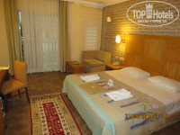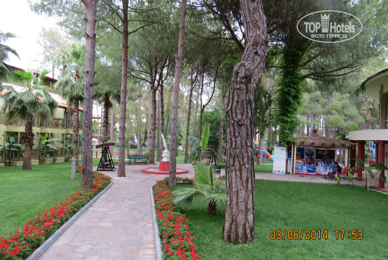 Отдыхали в отеле в начале июня 2014 года. Двое взрослых и ребенок 10 лет. В отель приехали вечером, разместили нас сразу после заполнения анкеты. Номер у нас был на 4 линии на 1 этаже. Мы заранее списывались с отелем и просили номер на 4, 5 или 6 линии, куда нас и поселили. Номер нормальный - на полу плитка, сантехника исправная, москитная сетка, несколько русских каналов, мини бар пополнялся регулярно - добавляли те напитки, которые выпивали. Убирались в номере каждый день и достаточно качественно, горничной через день оставляли по доллару. Полотенца меняли те, которые бросали на пол, постельное белье меняли где-то через 3 дня. Территория у отеля не очень большая, но очень зеленая и ухоженная. Поскольку отель расположен в сосновом лесу воздух там изумительный особенно после дождика. На территории отеля живет очень много чаек и по утрам, а иногда и ночами они сильно кричат. Хотя через несколько дней к их крикам уже привыкаешь и не особо обращаешь внимание. Пляж - мелкая галька, в воде большие камни. Лежаков было достаточно всегда и у моря и у бассейнов. Что особо хочется отметить так это питание - выше всяких похвал и на любой вкус. Было и мясо и рыба и курица и все вкусное. Много различных и вкусных десертов и выпечки. Несколько видов мороженого, разнообразные фрукты. На завтрак и в обед были фреши (апельсиновый и томатный), остальные соки, что хочется отметить, были концентрированные соки из коробок, а не разведенные юпи. Первый отель где кроме простого вина было и шампанское. Пиво в минибаре и на розлив не очень. В целом отель понравился, рекомендуем всем, особенно для семейного отдыха.