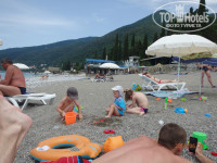 Пляж свой, на нем только отдыхающие санатория. На пляжу мелкая и крупная галька. Есть деревянные и пластиковые лежаки, спасатель, слушающий Modern Talking :). Через 2 метра захода в воду уже глубина. Если отплыть подальше – вид на горы впечатляющий.
