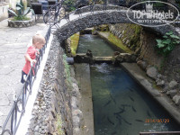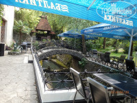 Территория тенистая. Отдельно от главного корпуса стоит 2-ой корпус (метров 300), тоже красивый, неподалеку заброшенное впечатляющее здание бассейна (система слива воды засорилась в 2006 году), с боку которого – кафе «Родник» с речной форелью. В холле главного корпуса wi-fi 100 руб за подкл, магазин. Есть ларьки и возле Гагрипша. На первом этаже – бесплатный теннис. Корд для большого тенниса на территории, остальные 2 спортплощадки заброшены. Из минусов – возле второго корпуса много открытых люков и колодцев, опасно для детей!
