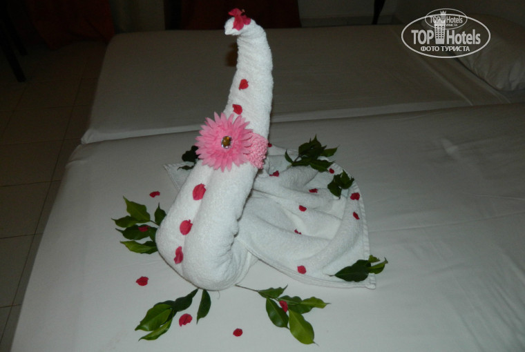 Пляж - это самый значимый фактор выбора этого отеля - модно смело отдыхать с ребенком, не беспокоясь, что он переломает ноги по отмершим кораллам, проткнется ежами. Берем с собой надувной матрас и ребенок счастлив. Конечно, смекалка наших соотечественников навысоте - кто с вечера не перевязал шезлонги косынками, тряпками, не застолбил их, тот в 6 утра несется на пляж - занимать места под солнцем, вернее в тени. Но и на хитрую точку есть... В первый день приезда подхожу к менеджеру на пляже - он часто появляется у будки с пляжными полотенцами, даю ему 2$ и показываю 4 лежака под зонтом, где мы хотим отдыхать. И, поверьте, завтра с утра эти лежаки будут застелены свежими пляжными полотенцами, а посягающие граждане будут бичбоями сопровождены на другие места. Поверьте, 30$ за две недели отпуска - не деньги (вы потратили больне и нет смысла омрачать себе отпуск переругиваниями с земляками - вернетесь на Родину-наверстаете). А так вы, независимо во сколько придете на пляж и отсутствует необходимость таскать пляжные полотенца из номера, с утра вам положили свежие (поверьте, даже цвет отличается от остальных, невыцветшие), вечером после того как вы ушли за вами их заберут.