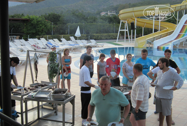 Всем привет!отдыхали с семьей 02 по 10 июля.с вылетом пудрили мозги и переносили рейс аш 2 раза Колавиа.в конечно итоге улетели с Внуково а ни с ДМД.и летели "Ред Вингс (Red Wings).и слава богу!им вернули лицензию после этой трагедии. всё просто супер!!! Заселили быстро за 5 мин...номер дали на дорогу!!!((конечно!!!очень шумно и кто привык к тишине и покою по возможности меняйте!!!я первые 3 ночи засыпал к утру!...питание нормальное!без изысков и много!я не парился с этим!если хочешь мясо то и можно постоять 10 мин в очереди т.к.повар на гриле 1! но мне это мясо и дома надоело!!!так что выбор за вами,а кто здесь пишет что кормят дерьмом,считаю эти люди едут ни на отдых,а пожрать,т.к слаще морковки в жизни не видели!....очень не приятно что занимают лежаки с вечера прошлого года и там сами не появляются!!считаю просто хамством и невоспитанностью!! как и на пляже кидать мусор где попало,а патом писать,что там грязь!!!а кто ее там оставляет???это господа Россияне т.е. мы сами!!......не спешите покупать рядом с отелем все что понравилось в первые дни. при выходе из отеля и на право и налево идут торговые ряды.товар одинаковый,но цены разные...сразу прикидывайте!!!сколько это БЫ стояло там где вы живете и скидывайте турку сразу минус 5 долларов. погода очень жаркая и следите за своим здоровьем!!!у нас многие болели!!!это распаренное тело под холодный душ возле моря и ледяные напитки!!!вот и ангина!!!(советую взять на этот случай с собой нужные медикаменты!конечно не Дай Бог особенно дети!!).......на балкончиках где вы будете сушить свое белье нет прищепок,иногда сильный ветер,мне до этого писали взять с собой из дома пару штук,оч пригодилось!!!!...ЛЮБИТЕЛЯМ НА НОЧЬ ПОПИТЬ КОФЕЙКУ!!! В номерах нет чайников,а кофе машину выключат в 23ч в баре,где напитки .у меня привычка брать с собой на самолет маленький термос 0.5л..он мне пригодился и в отеле!!!!я набирал кофе вечером и мог еще попить ночью и рано утром,это для тех кто начинает день с никотина и кофе как я!!! общая оценка моя это твердая 4..да!!забыл!!!радует анимация с утра и до ночи для всех и каждого!Ваши дети будут все во внимании анимации.!!!!!Господа родители!!!!!!!!не оставляете в бассейне без присмотра маленьких деток возле горок!!!!иногда с них вылетаю дядьки-турки кг.так 120 аш вода летит до бара.если будут вопросы отвечу!!!всем отличного отдыха!и будьте взаимно вежливы и воспитаны везде!!!это всего лишь отдых!!.!