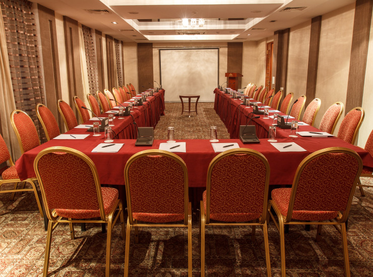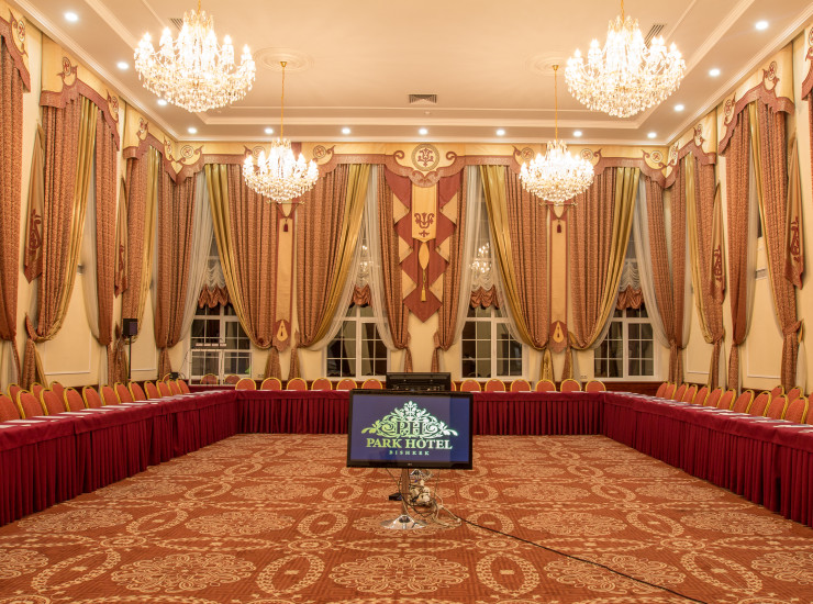 Конференц - зал Ballroom оборудован для проведения мероприятий, как протокольной встречи, так и для торжеств: организация синхронного переда, аудио- и видеозапись мероприятия, предоставление любого вида микрофонов: шнуровые, радио-, головные гарнитуры, конференц-система для выступающих за столом президиума.