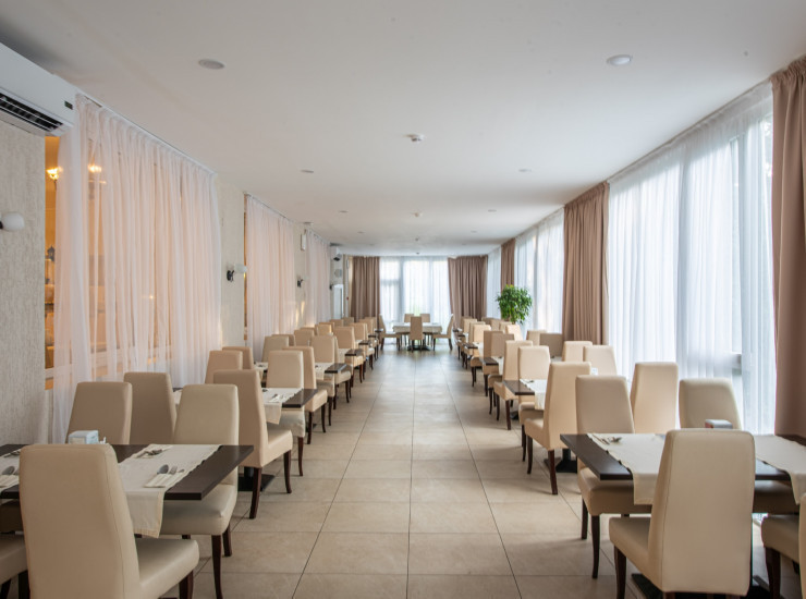Два светлых и просторных зала ресторана, оформленные в итальянском стиле, отличаются с одной стороны простотой, с другой изыском. В отделке интерьера применяются натуральные материалы, что подчеркивает единение с природой и вписывается в общую концепцию курорта.