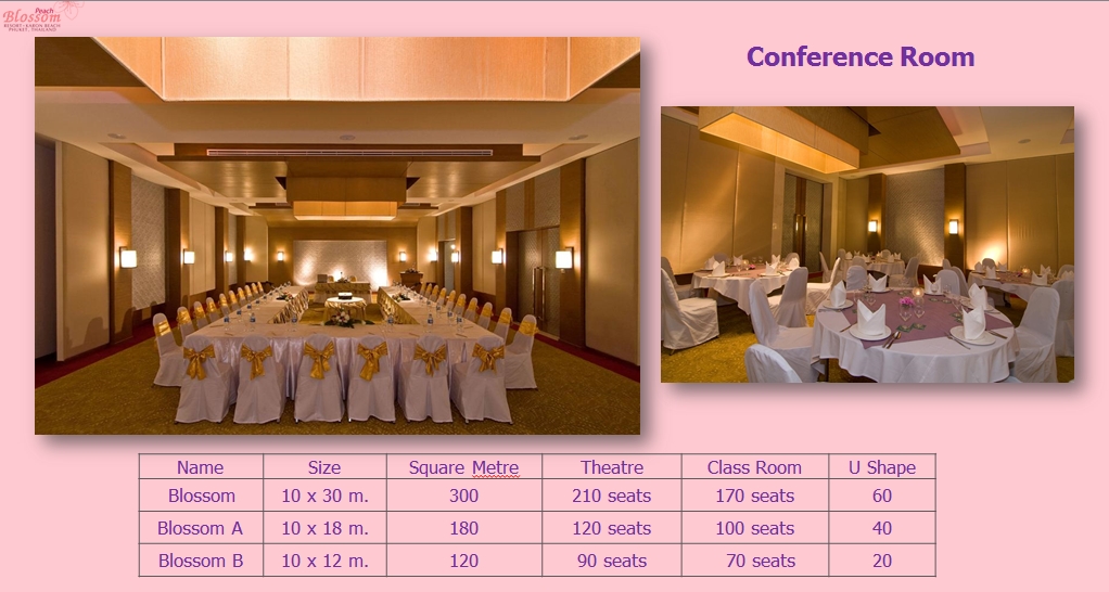 В нашем спа-отеле Peach Blossom есть первоклассный конференц-зал для гостей, совершающих деловую поездку. Зал оснащен современной аудио и видео техникой, он отлично подходит для проведения деловых встреч и небольших групповых собраний. Кроме того, наш отель удобно размещен между пляжами Ката и Карон, где у нас есть вилла с бассейном для VIP гостей.